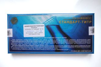 Стандарт-титр Калий йодноватокислый 0,1н (Йодат калия) KJO3- используется для титриметрического анализа. В ходе такого исследования готовится стандартный раствор с известной концентрацией. Получают его путем растворения содержимого ампулы в мерной колбе с дистиллированной водой.